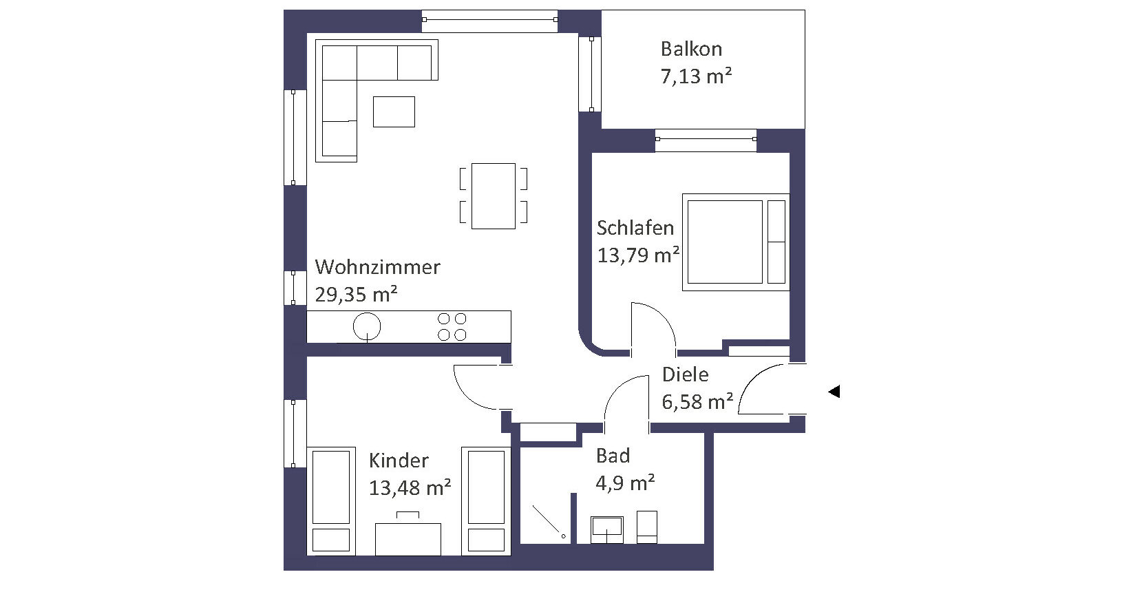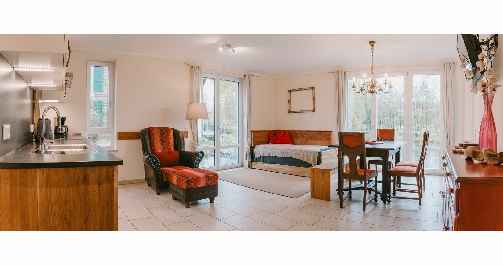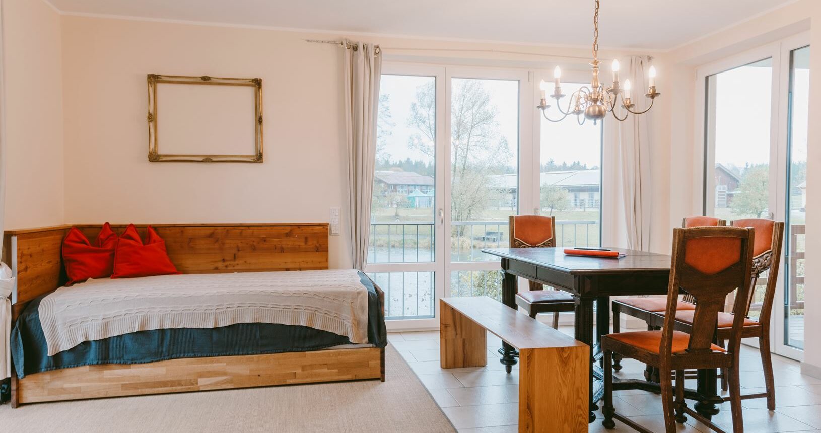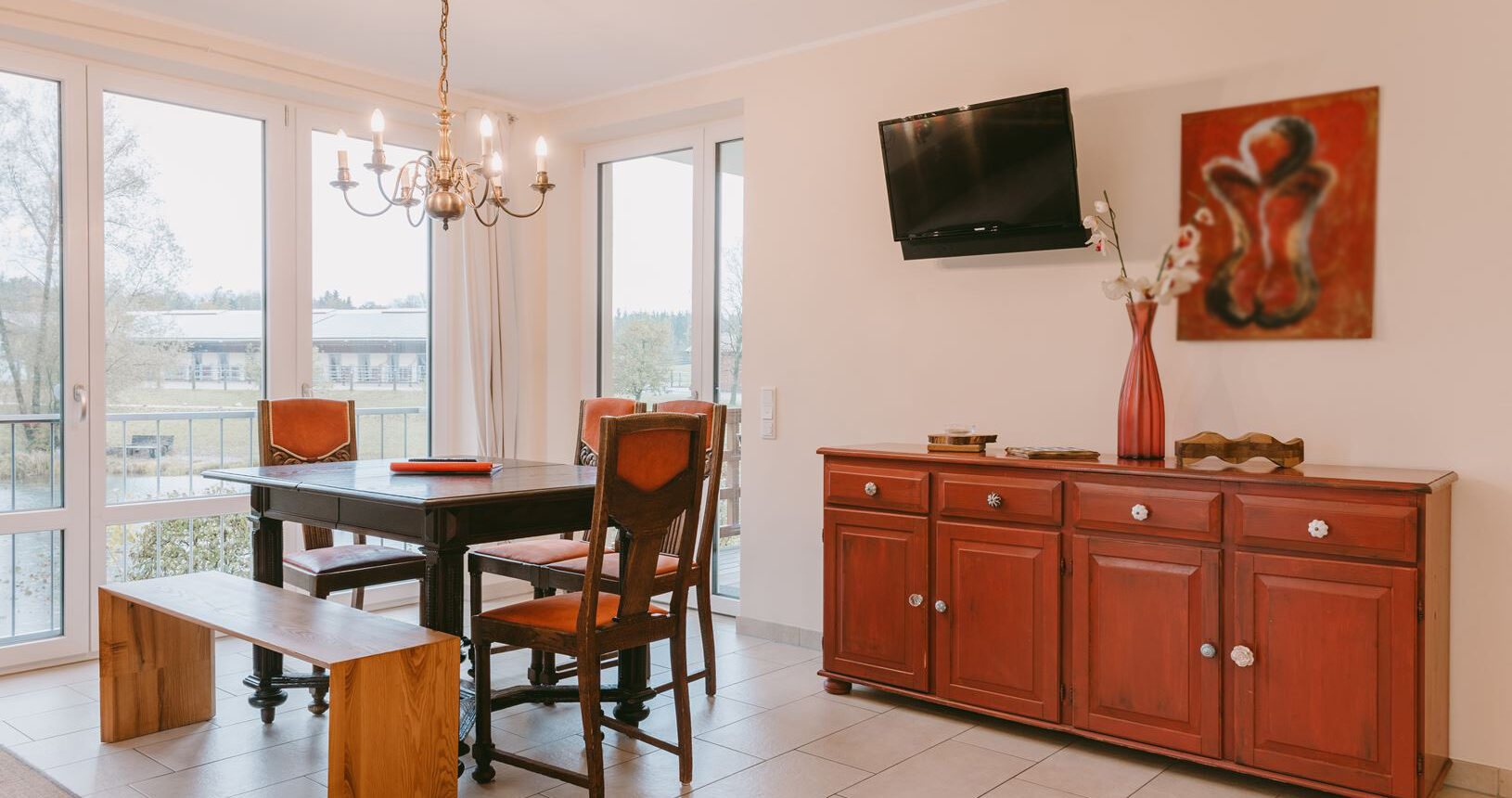 This is our biggest and probably the most beautiful vacation apartment on Gut Mischenried. It has a big living room, a spacious bathroom, two bedrooms, a balcony and a small terrace. It is situated on the ground floor and faces north. It is our most suited vacation apartment for a family vacation in Munich.