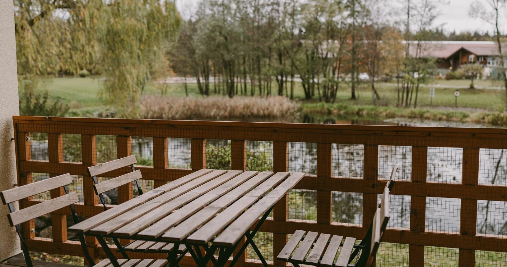 The balcony is accessible from the master bedroom and the living room. It is big enough for six people and offers a great view across our pond and into the horse ranch.