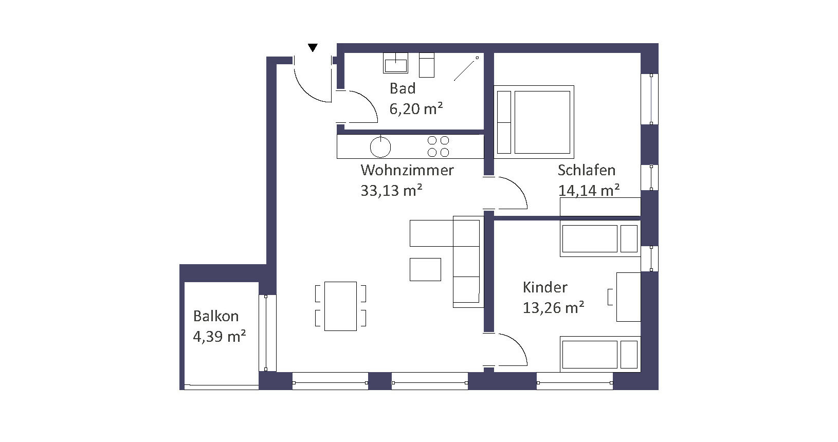 This apartment is 71m² or 764 ft² in size and faces south. Big glass doors and windows let in lots of natural light and provide a nice view over the fields.
