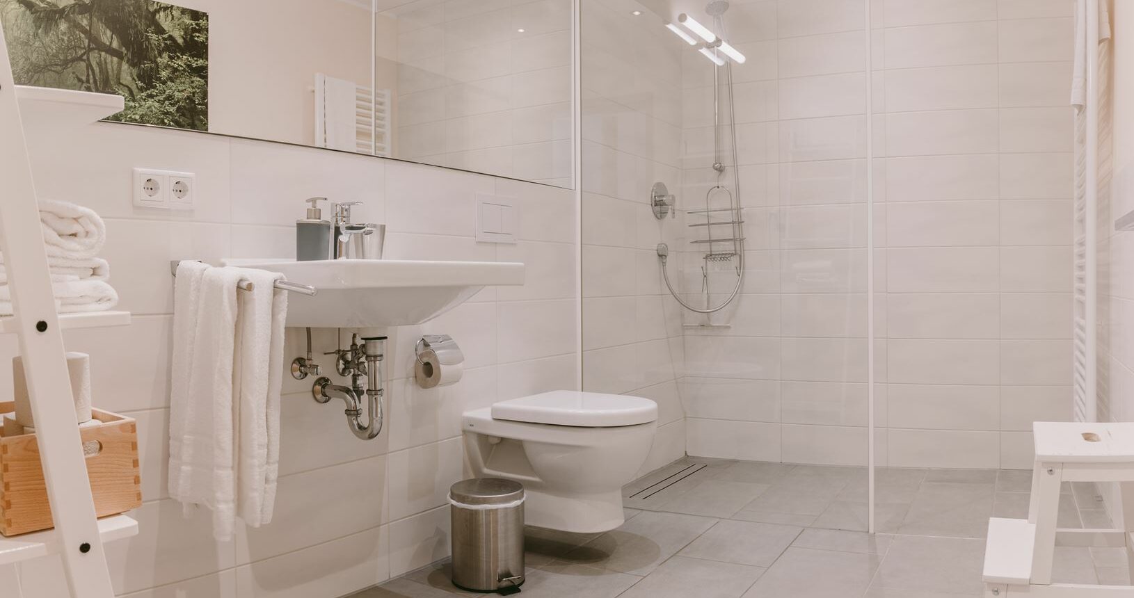 The bathroom is equipped with an extra spacious and comfortable shower.